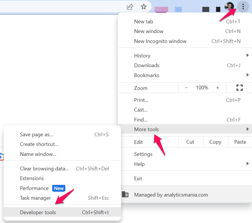First, go to the subdomain A and open developer tools (in Google Chrome, that can be found by clicking three dots at the top right corner and then going to More tools > Developer Tools).