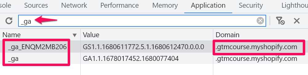 Then go to Application > Cookies > select your subdomain. In the search field, enter _ga. Her,e you should see at least two cookies: