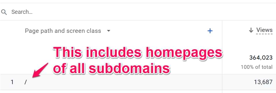 One of the default dimensions that is displayed in standard GA4 reports is Page Path. It shows the part of the URL that comes after the hostname (e.g.,/pages/contact/). But what if multiple subdomains have the same page path (e.g., the homepage of both subdomains will be displayed as / )?