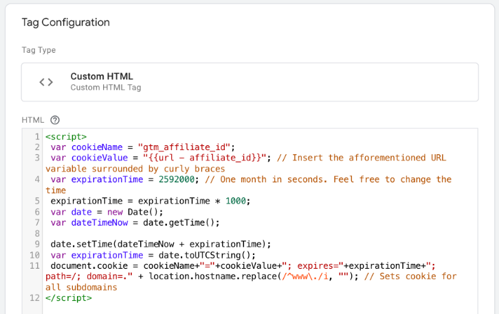 - The expirationTime controls how long the cookie is stored. Choose a duration that works for you, such as one or two days. A question to ask yourself is, “If a user lands on your site through an affiliate link, makes no purchase that day, but then makes a purchase one week or month later, do you still want this associate to that affiliate ID?”. If yes, then you can make the duration of the cookie longer (e.g. 30 days). The decision here is yours.