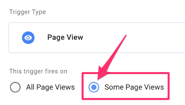 Since we want the cookie only to be triggered when the affiliate ID query parameter is present in the URL, we will limit the trigger to fire on only some page views. Select “Some page views”.