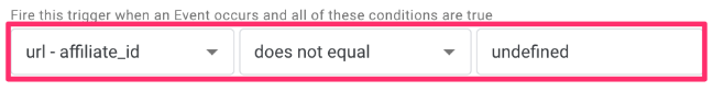 In the conditions, select “url – affiliate_id”, then “does not equal” and type “undefined” in the textbox. This means the cookie will only collect the affiliate ID when it is available in the URL.