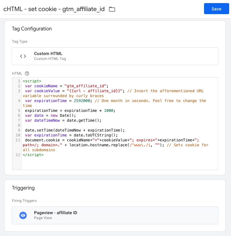 Back in the tag, which now contains a trigger, name the tag “cHTML – set cookie – gtm_affiliate_id” and save.