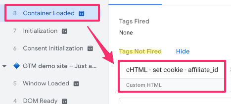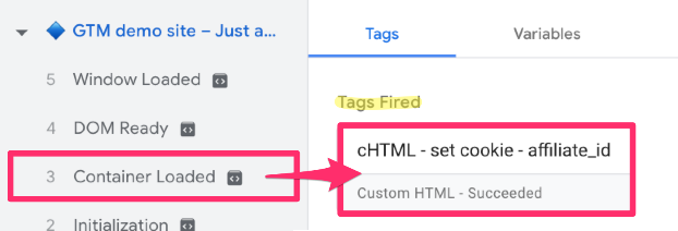 To test the cookie/tag, you will, again, need to open Preview mode (make sure you include the affiliate ID in the URL!) Once your website has loaded, check that the cHTML tag did fire on the first page that opens (since there is an affiliate ID query parameter in the URL).