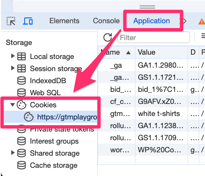 Open the Application tab (along the top menu), select “Cookies” (in the right-hand menu) and click on your site’s URL in the dropdown.