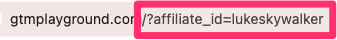 When a visitor lands on your site through an affiliate link, you will see that the affiliate ID appear in the URL as a query parameter (it appears after the ?), so we want to store this temporarily in a cookie. Then, when a visitor makes a purchase, we will send that affiliate link with the purchase event. To do this, we must store the value in a URL variable.