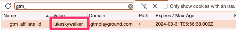 In the search box, type “gtm_” to find the gtm_affiliate_id cookie (or whatever you decided to name the cookie). The Value will collect the affiliate ID from the link that a visitor used to get to your site.