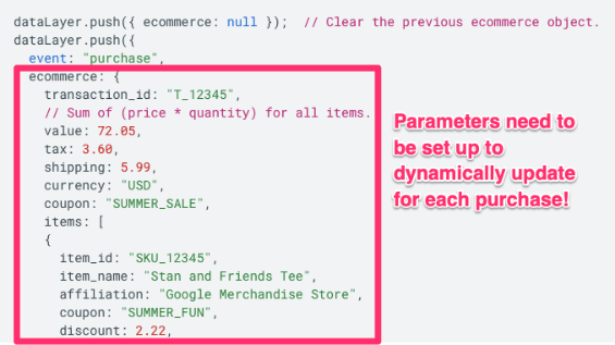 Suppose you’re using the Google recommended purchase event (which is what we’ll be referencing in this tutorial). In that case, your developer will need to add the event to your website’s code (Data Layer) to fire each time a user makes a purchase and ensure that the event’s parameters collect relevant information (e.g., the transaction and item information).