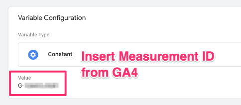 Copy the Measurement ID and paste it into the Value of the constant variable. Save your new variable as “Constant – G-XXXXXXXXXX” (or whatever makes sense to you). Read this blog post to learn more about the constant variable in Google Analytics 4.