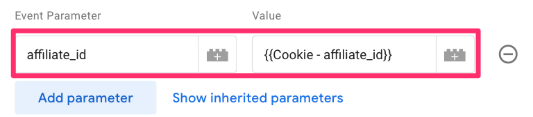 Most importantly (for this tutorial), you must add the affiliate_id from above as a parameter. Name the Event parameter “affiliate_id” and set the value as the 1st party cookie “Cookie – affiliate_id”.