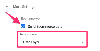 Under More Settings, select “Send Ecommerce data”. Keep the Data Layer as the Data source. This will only work if your Data layer push event follows the GA4 documentation from above, aka the parameter names are the same (you don’t need to use all of them, though)!