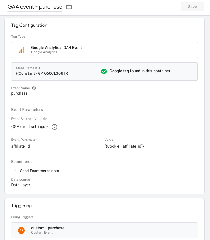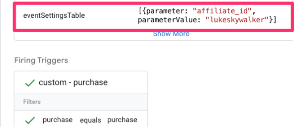 In the case where you will use this affiliate ID for more than just when a user makes a purchase, you should include this in your event settings variable. However, we will only cover the purchase event in this tutorial, so I don’t need to add it to my event settings variable.