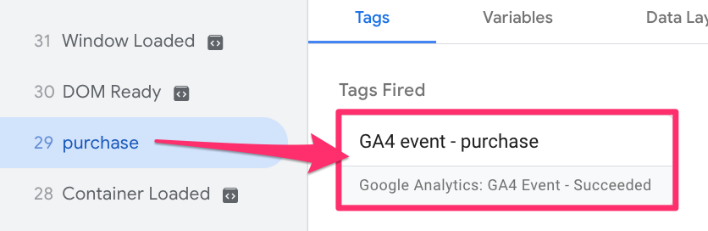 Back in Preview mode, confirm that the tag appears under the purchase event.