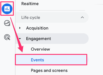 In GA4, go to Reports in the left-hand sidebar and click Life Cycle >Engagement > Events.