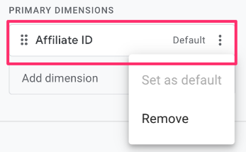 For the Dimensions, select “Affiliate ID”. You can keep or remove the Event name dimension and, if you keep the Event name, you can set the Affiliate ID as the primary dimension by clicking the three dots and selecting “Set as default”.
