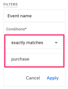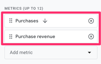 For the Metrics, select “Purchases” and “Purchase revenue”. You can drag the metrics up or down to change the order in which they appear in your report.