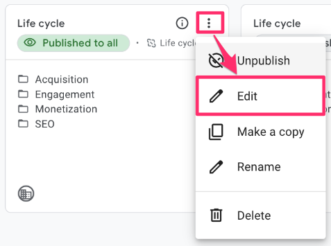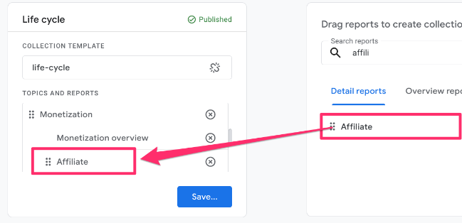 Search for the report you just saved in the right-side search bar and drag it over into either the Monetization section or the Engagement section (again, do what makes sense to you! Maybe you never want to make a new folder altogether).