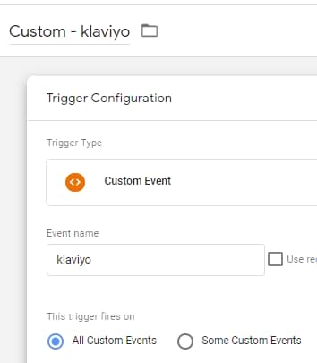 This type of trigger allows you to pick any dataLayer.push and use it as a tag-firing condition. Since we are interested in the klaviyo dataLayer.push, we need to enter that in the Custom Event trigger.