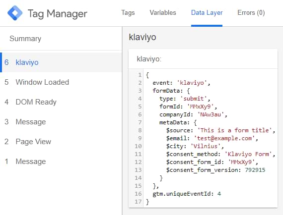 Luckily, in Klaviyo’s case, we are using a specific form listener that pushes data to the Data Layer only after successful form submission.