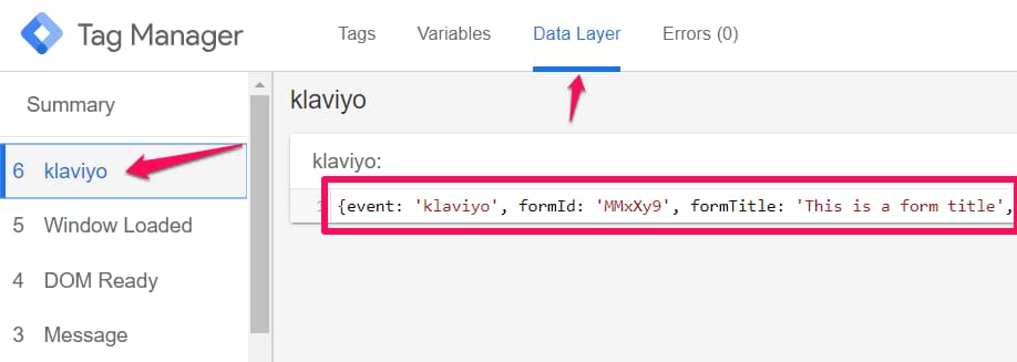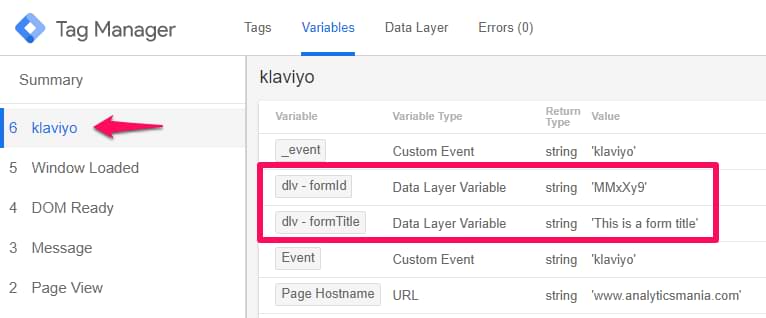 Resubmit Klaviyo’s form once again, then click on klaviyo in the preview and debug console > go to Variables tab and check whether those variables display the correct values.