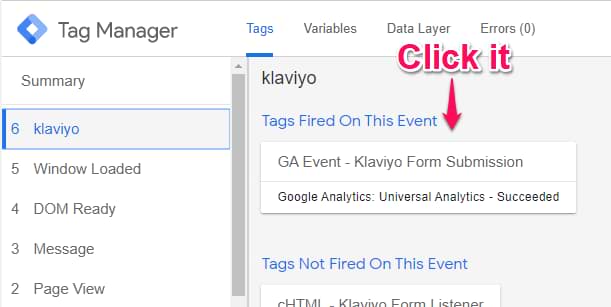 #2. Click it and you should see that the GA Event – Klaviyo Form Submission tag has fired