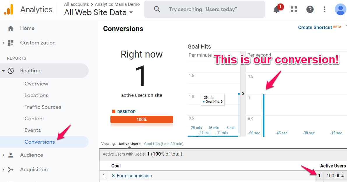Resubmit the form once again and check whether your goal (a.k.a. conversion) is displayed as completed in the real-time reports. How do you know if it was tracked? You’ll see an increased count next to it.