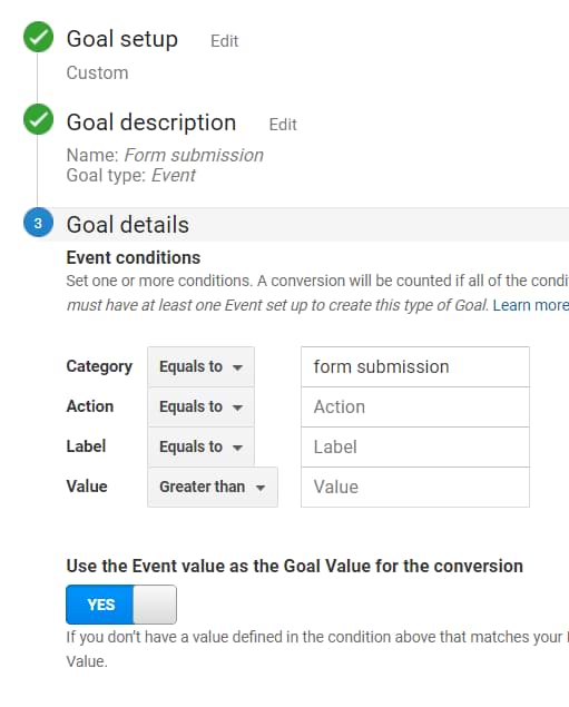 If you enter only the Event category, then all events with the form submission event category will be treated as completed goals. If you want to specify and treat only particular form’s submissions as goals, then you could also enter that form’s ID in the Event Action field.