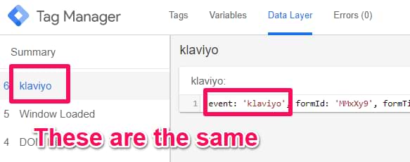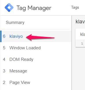 In plain English, we will want to fire a GA tag when the Klaviyo form is successfully submitted. How can we translate this into something that GTM understands? The answer is when we see a klaviyo event in the preview and debug mode.