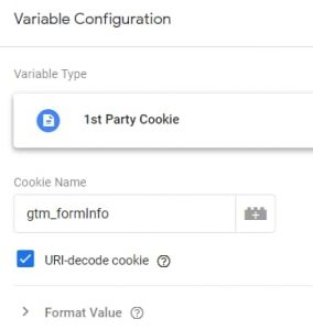 Go to Variables > New > 1st Party Cookie variable and enter the following settings (case-sensitive):