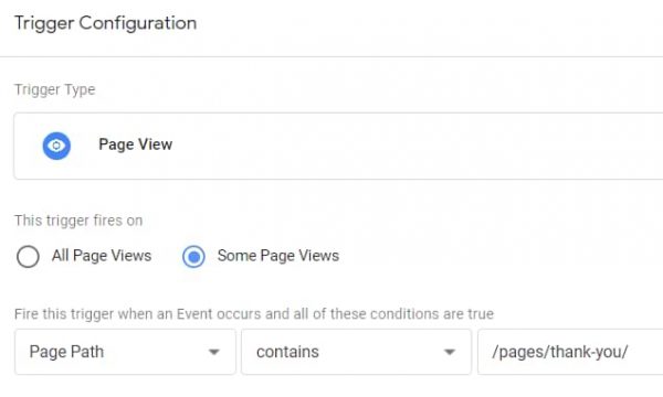 Create a Pageview trigger that activates on a “thank you” page. Say that the URL of your Thank you page is example.com/pages/thank-you/. In that case, the settings of the trigger could look like this: