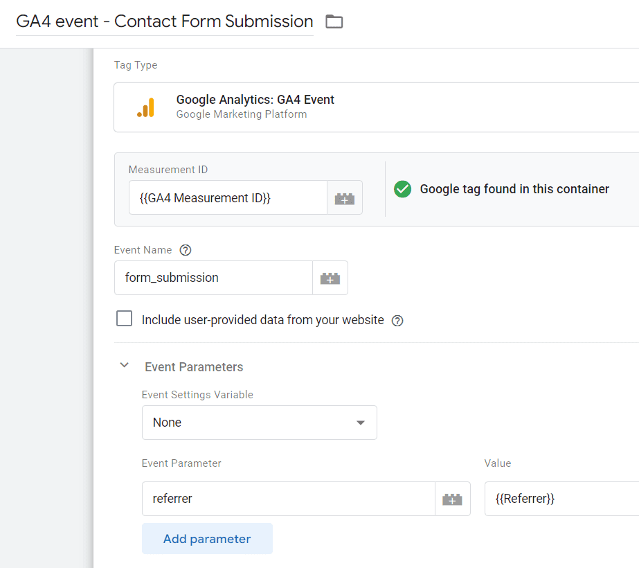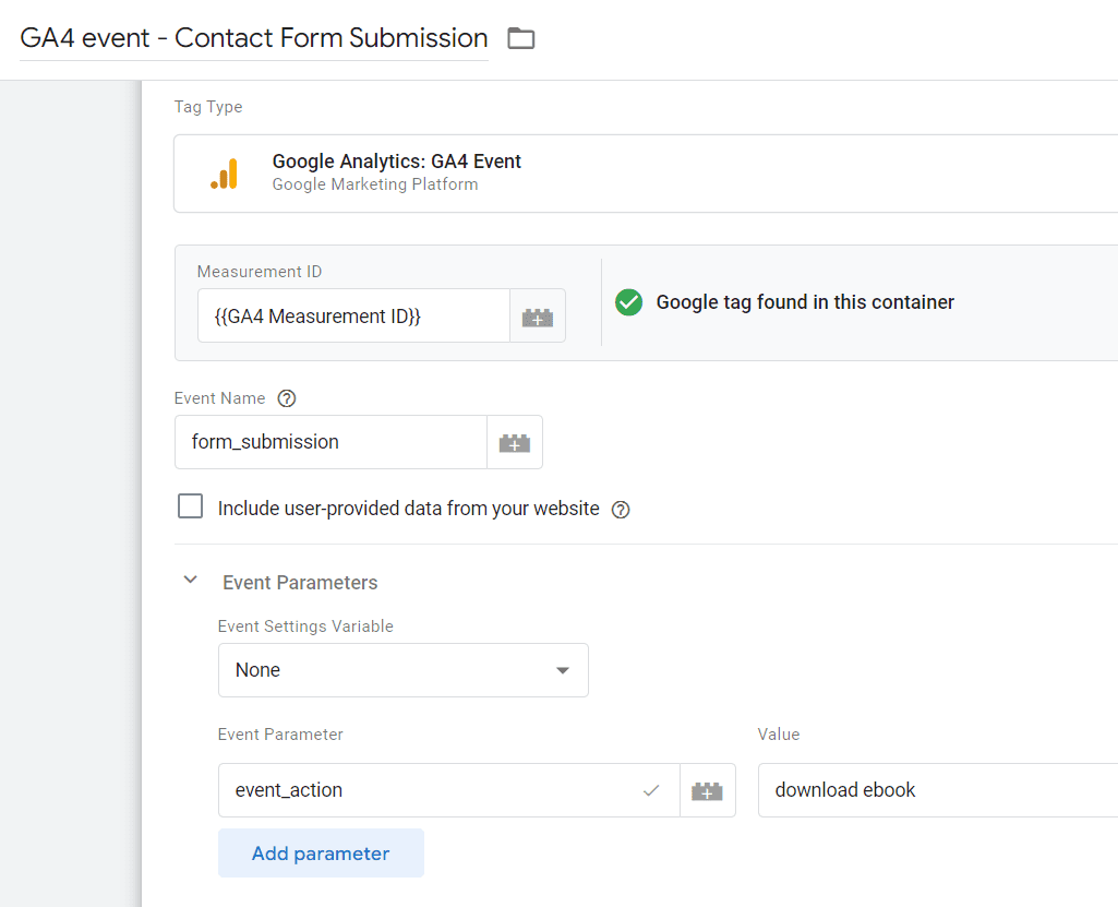 This tag will fire when a visitor lands on a “Thank you” page. In the form_name field, I inserted the previously created URL Variable. It will return the value of the form_name parameter that is visible in the URL of every Thank you page.