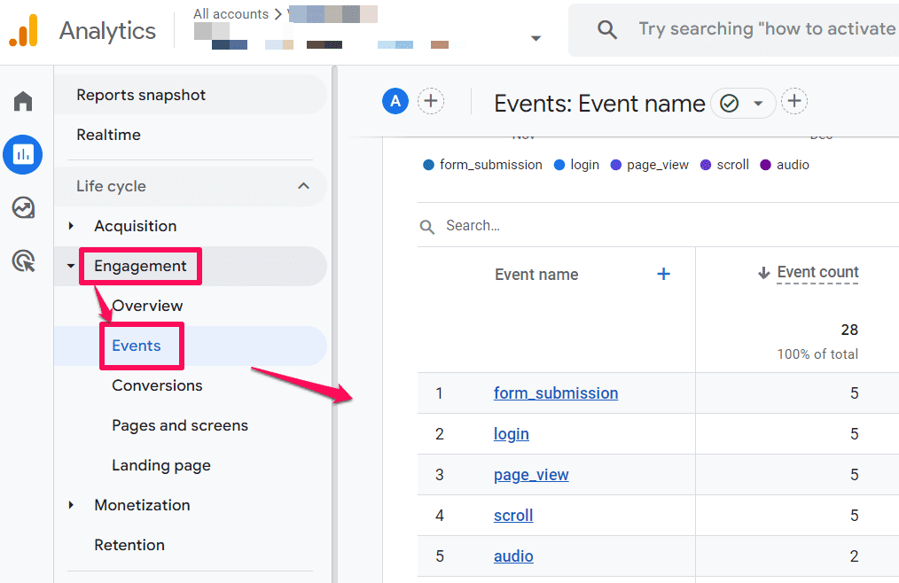 - All of these events will appear in Reports > Engagement > Events. Here, you can play around with the event data as you wish.