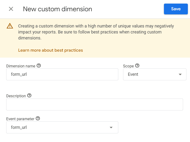 - Click on Create Custom Dimension, enter the details of the form_url variable and hit Save. That’s it!