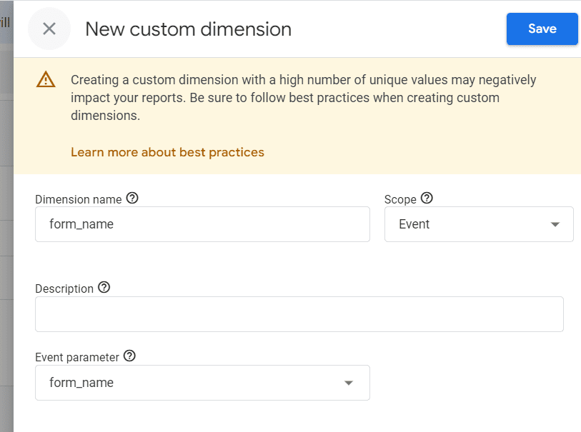 - Click on Create Custom Dimension, enter the details of the form_name variable and hit Save. That’s it!