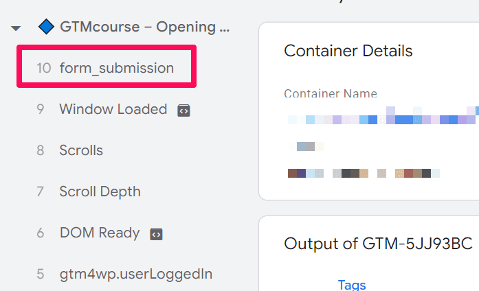 Save all the changes, refresh the GTM preview and debug mode, and submit the form once again. The Preview and Debug page should show form_submission as one of the events recorded on the page.