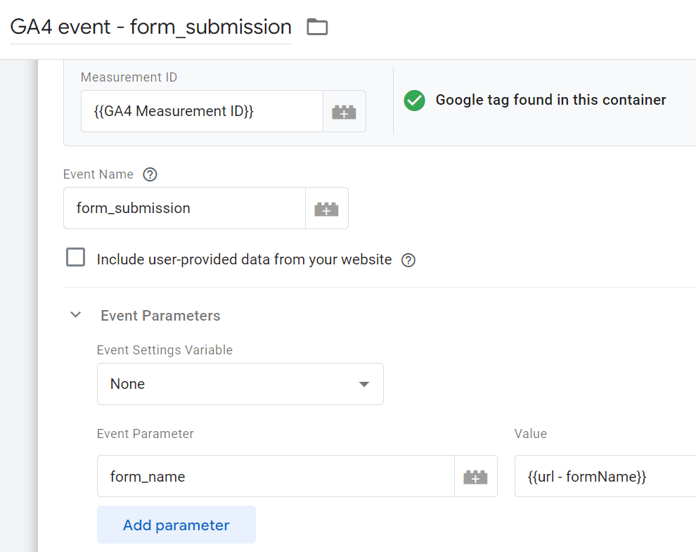 You can choose any other (more meaningful value) instead of just “form1”. What we will do next is to create a URL Variable that will return the value of formName, and we will use it in the GA Event Tag.