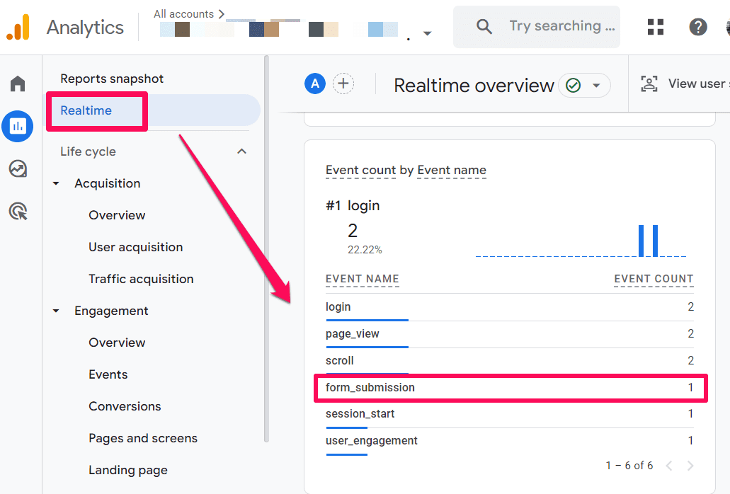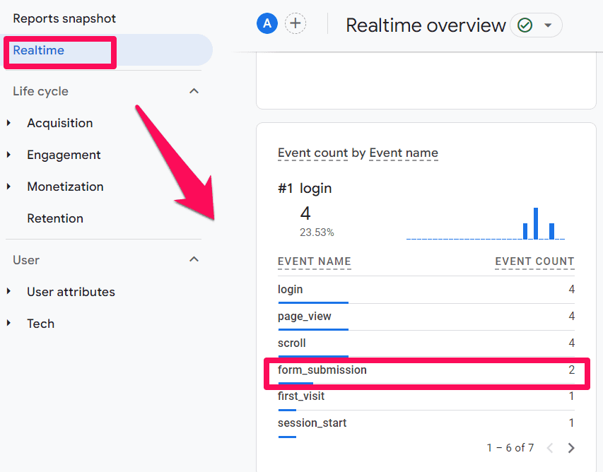 Since it’s working here, you can proceed to publishing the container. Just to make sure that the event is being passed to GA4, perform the form submission again and navigate to the GA4 Reports > Realtime