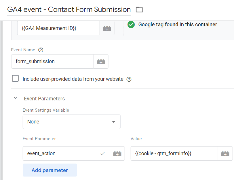 So, to sum up, when a visitor clicks the Form Submit button, we will store the Page Path in a cookie. When the visitor lands on a “Thank you” page, we’ll take the info of that cookie and use it in the GA Event Tag.