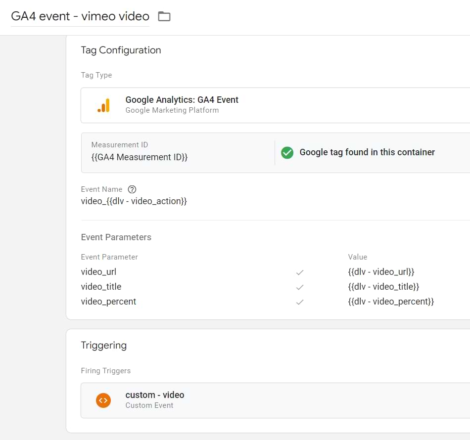 Don’t forget to test this entire configuration. Enable GTM Preview and Debug mode, go to a page with an embedded Vimeo player and click Play. The next thing you should see is a video event in Preview and Debug mode’s event stream. Click it and see whether the GA4 event tag has fired.