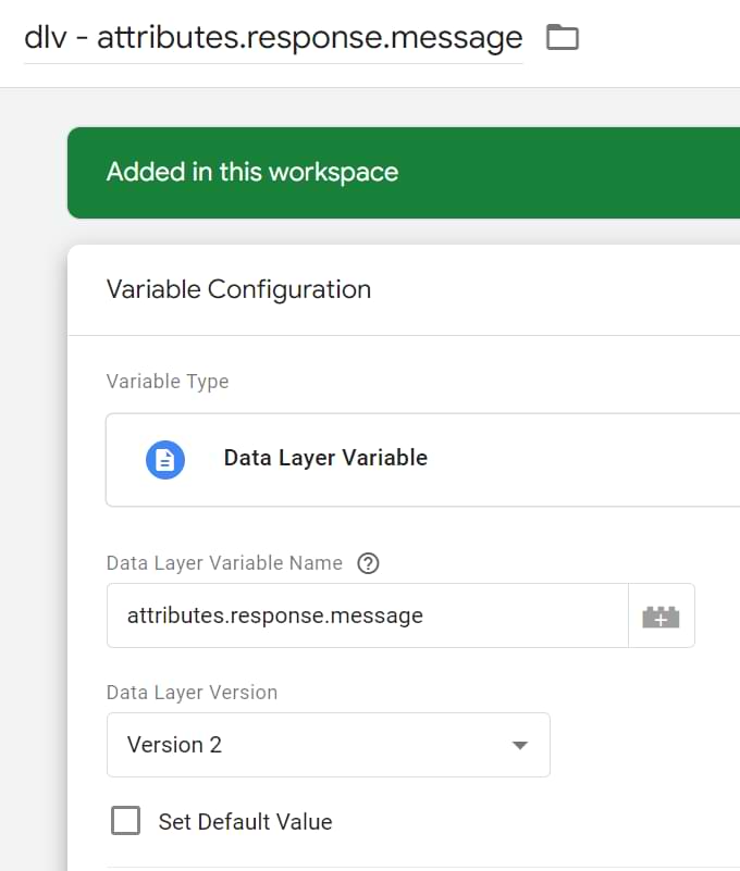 Save the variable. Now, it’s time to access the message. Enter attributes.response.message in the Data Layer Variable.