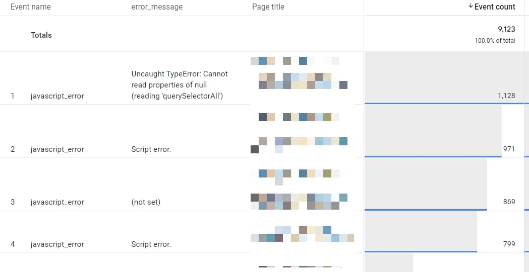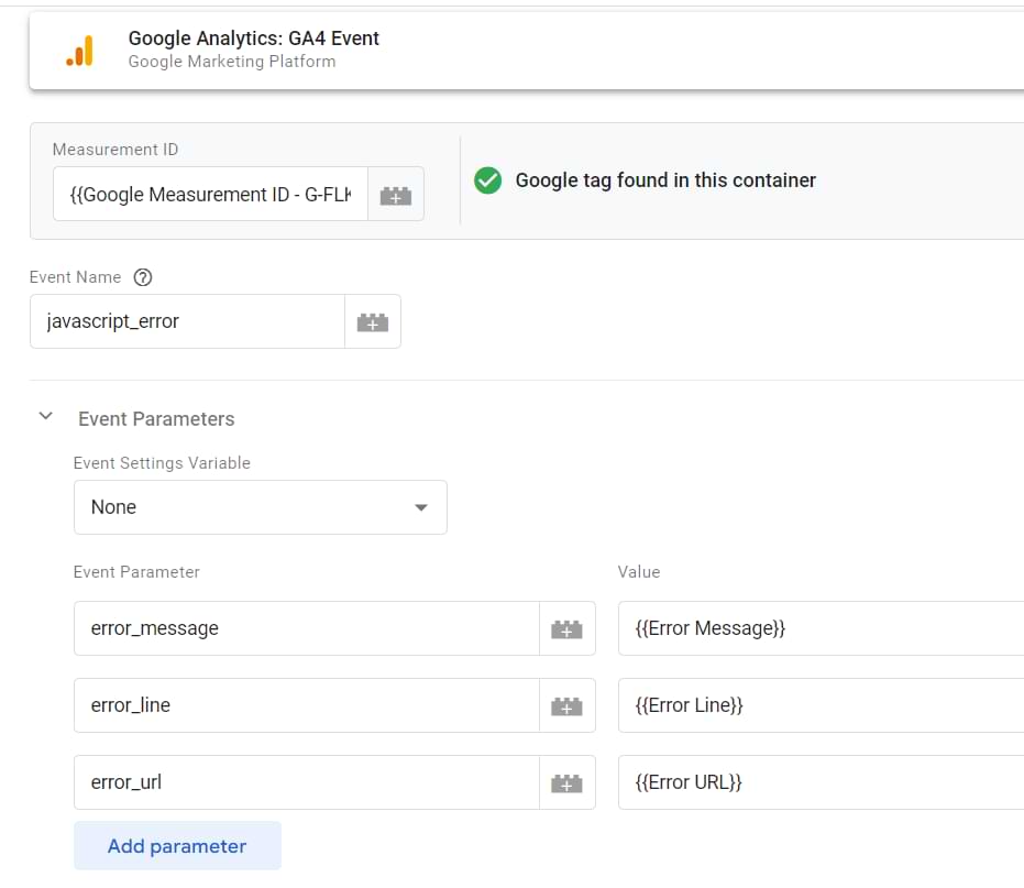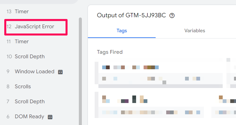 To do this, let’s begin by adding an event tag that fires every time there is an error with the website. In this case – Javascript errors, for example: