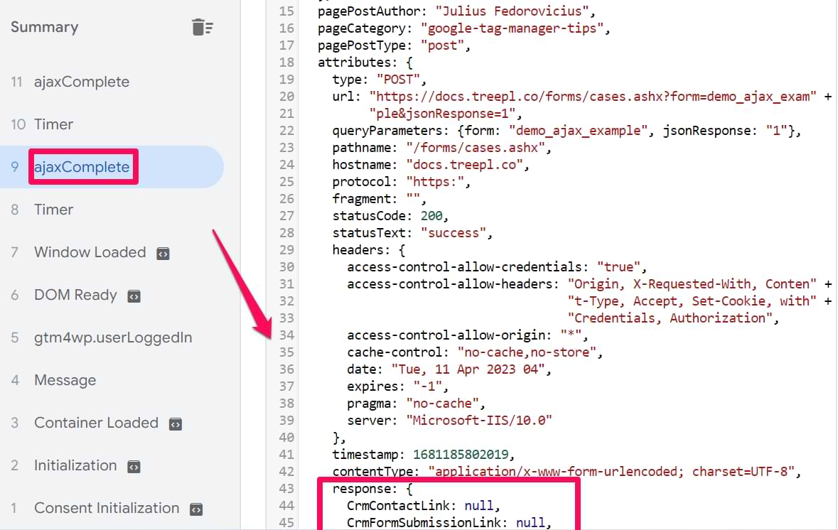 The custom HTML tag will fire on the Pageview event. Don’t worry about that. Now, try to submit the form again. Did the ajaxComplete event appear in the GTM preview mode? Yes? This means you’re working with an AJAX form.