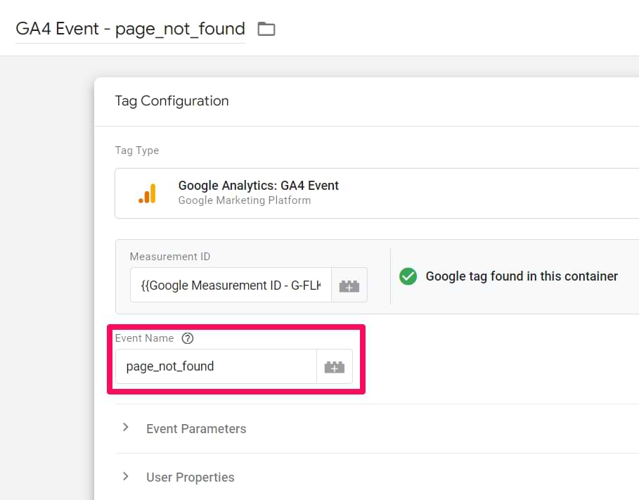 - Create a Google Analytics Event tag that sends the 404 error to GA4 as an event