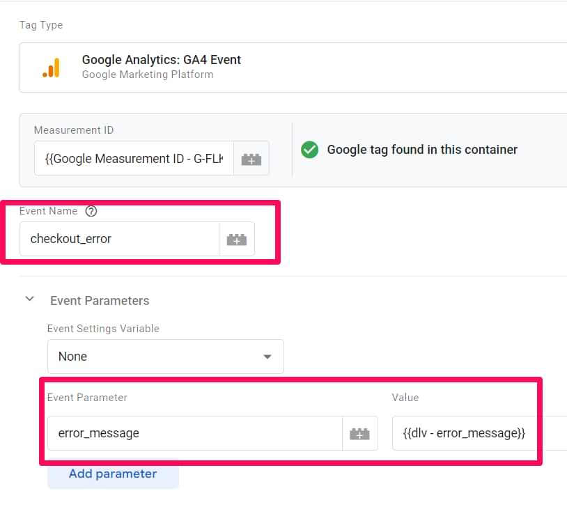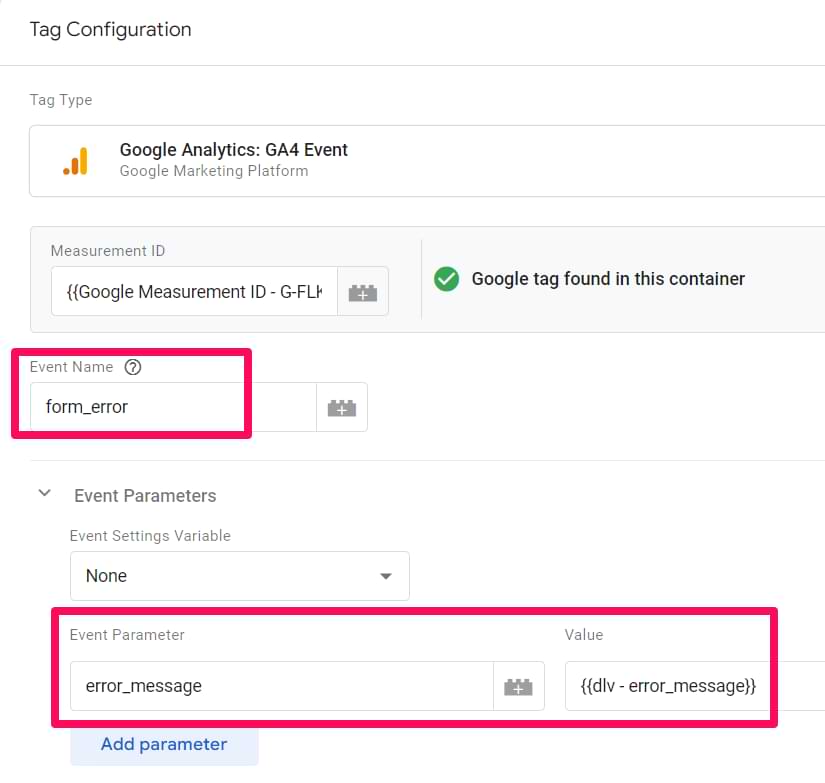 Finally, create a Google Analytics event tag to send the error to GA4. Go to Tags > New > Google Analytics Google Analytics: GA4 Event and enter the following settings.
