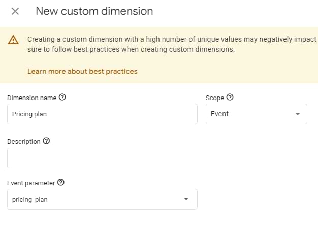 "• Enter the dimension name as plan, Event as the scope, and plan as the Event parameter name. Now, click Create."