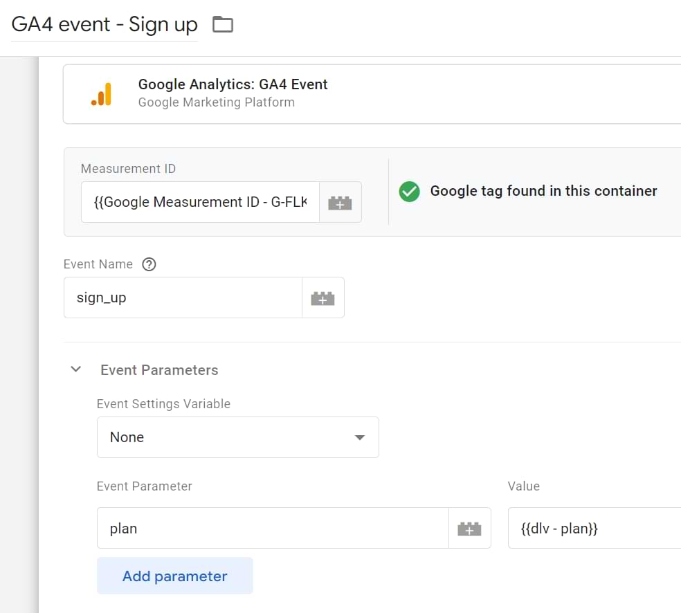 When setting up 'dlv-plan' we use User Defined Variables. But when we register ‘plan’ as a custom definition in GA4 we make it Event-scoped.